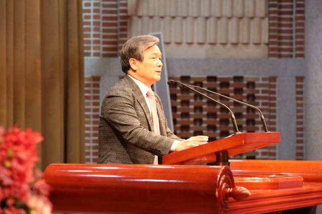 한국기독교직장선교연합회 주대준 이사장이 14일 오전 서울 노원구 한국성서대 로고스홀에서 열린 ‘2020 직장선교 전국대회 및 예술제’에서 인사말을 하고 있다.