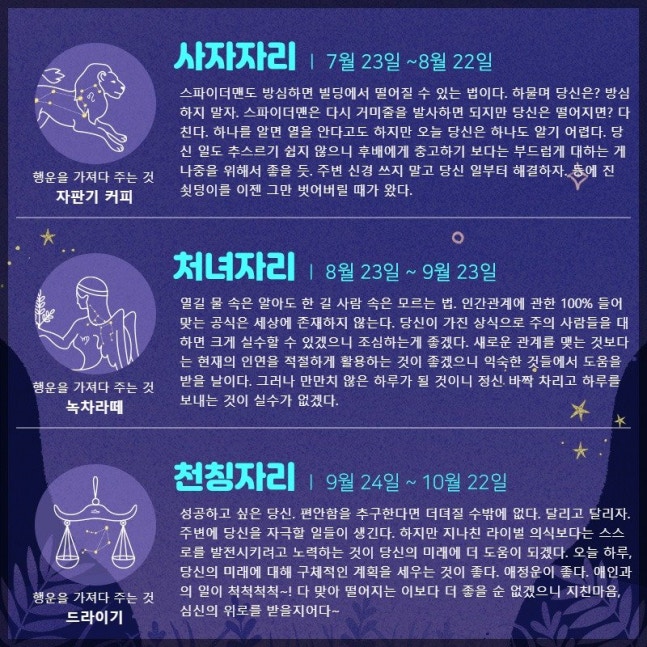 사자자리 (7.23 ~ 8.22) 스파이더맨도 방심하면 빌딩에서 떨어질 수 있는 법이다. 하물며 당신은? 방심하지 말자. 스파이더맨은 다시 거미줄을 발사하면 되지만 당신은 떨어지면? 다친다. 하나를 알면 열을 안다고도 하지만 오늘 당신은 하나도 알기 어렵다. 당신 일도 추스르기 쉽지 않으니 후배에게 충고하기 보다는 부드럽게 대하는 게 나중을 위해서 좋을 듯. 주변 신경 쓰지 말고 당신 일부터 해결하자. 등에 진 쇳덩이를 이젠 그만 벗어버릴 때가 왔다.