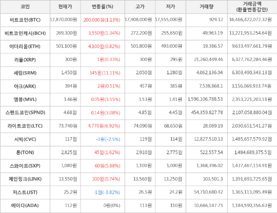 > [한국경제TV 라이온봇 기자] 비트코인, 비트코인캐시, 이더리움, 리플, 세럼, 아크, 엠블, 스펜드코인, 라이트코인, 시빅, 톤, 스와이프, 체인링크, 저스트, 에이다 [표]가상화폐 시세 (제공: 암호화폐 거래소 업비트)현재 암호화폐 거래소 "업비트"에 따르면 가상화폐 대장 격인 비트코인의 시세는 전일 대비 200,000원(1.13%) 상승한 17,870,000원에 거래되고 있다. 비트코인을 제외한 가상화폐 동향은 상승이 우세하다. 상승세를 보이는 가상화폐는 총 11종목으로 이 중 가장 큰 상승세를 보이는 세럼은 전일 대비 11.11% 상승한 1,450원에 거래되고 있다. 또한, 라이트코인(6.92%, 73,740원), 스와이프(5.88%, 1,080원), 엠블(3.55%, 1.46원), 스펜드코인(3.08%, 4.68원), 톤(1.62%, 2,825원), 비트코인캐시(1.34%, 269,300원), 이더리움(0.82%, 501,100원), 체인링크(0.74%, 13,550원), 아크(0.51%, 394원), 리플(0.33%, 300원)이 상승세를 나타냈다. 하락세를 보이는 가상화폐는 총 2종목으로 저스트와 시빅이다. 저스트는 현재 전일 대비 -3.82% 하락한 25.2원에 거래되고 있으며, 시빅은 -2.5% 하락한 117원에 거래되고 있다. 한편 거래금액 기준으로는 비트코인, 비트코인캐시, 이더리움 순으로 가장 활발한 거래를 보이고 있다. 라이온봇 기자 -한국경제TV※ 본 기사는 한국경제TV와 `금융 AI 전문기업 씽크풀`이 실시간으로 작성한 기사입니다. 라이온봇기자 ▶ 네이버 홈에서 [한국경제TV] 채널 구독하기 [생방송보기] ▶ 대한민국 재테크 총집결! - [증권 / 주식상담 / 부동산]ⓒ 한국경제TV, 무단 전재 및 재배포 금지