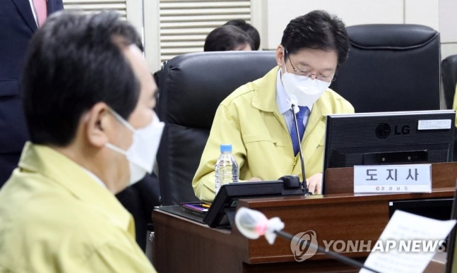 (창원=연합뉴스) 김승두 기자 = 정세균 국무총리가 4일 경남 창원 경남도청 재난안전대책본부에서 열린 '경남도 재난안전대책본부 회의'에서 발언하는 동안 김경수 경남도지사(오른쪽)가 메모하고 있다. 2020.12.4