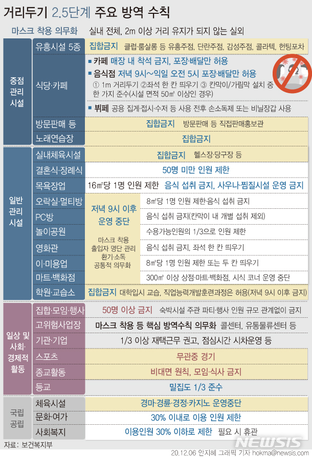 [서울=뉴시스] 정부가 8일 0시부터 28일 자정까지 3주간 수도권에 대해 사회적 거리 두기 2.5단계를 적용하고 비수도권도 2단계로 상향한다. (그래픽=안지혜 기자) hokma@newsis.com모든 실내체육시설 집합금지…성탄절도 비대면으로