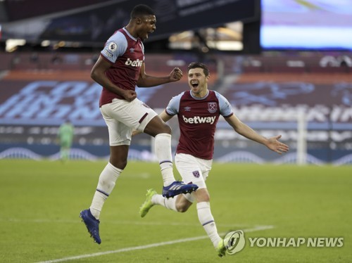 Ben Johnson (L) of West Ham celebrates with teammate Aaron Cresswell (R) after scoring the equalizing goal during the English Premier League soccer match between West Ham United and Brighton Hove Albion in London, Britain, 27 December 2020. EPA/Kirsty Wigglesworth / POOL EDITORIAL USE ONLY. No use with unauthorized audio, video, data, fixture lists, club/league logos or 'live' services. Online in-match use limited to 120 images, no video emulation. No use in betting, games or single club/league/player publications.