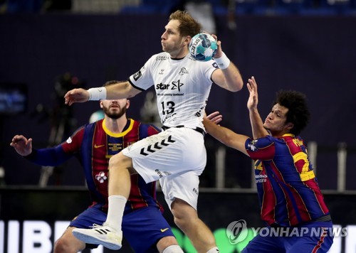Barcelona's Thiagus Petrus (R) in action against Kiel's Steffen Weinhold during the 2020 EHF FINAL4 Handball Champions League final match between FC Barcelona and THW Kiel in Cologne, Germany, 29 December 2020. EPA/FRIEDEMANN VOGEL