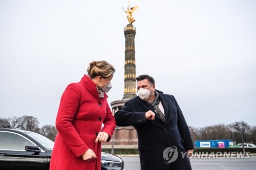 Berlin Interior Senator Andreas Geisel (R) and German Minister for Family, Senior Citizens, Women and Youth Franziska Giffey greet with an elbow check during a visit of police forces at Victory Column in Berlin, Germany, 31 December 2020. Berlin defined 54 firecracker ban zones, where the attendance and the use of pyrotechnics are forbidden. Police is expected to be busy, to assert the ban although the sale of fireworks was prohibited this year. EPA/CLEMENS BILAN