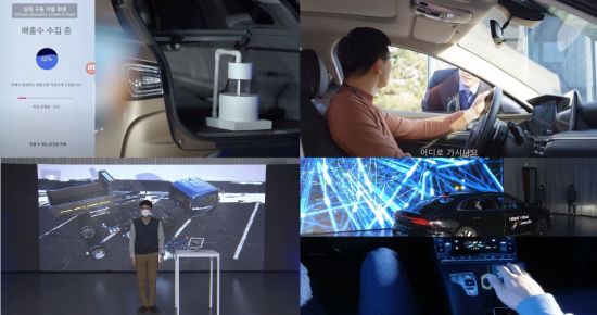 현대기아차 올뉴 아이디어 페스티벌의 실물 제작 부문 온라인 발표 장면. 좌측 상단부터 시계방향으로 대상 ‘Car Pure’, 금상 ‘Safe Guard’, ‘Untact Virtual Controller’, ‘인터렉티브 디지털 쇼룸’의 시연 모습(사진=현대기아차)[아시아경제 김지희 기자] 현대기아자동차가 포스트 코로나 시대 대비를 위한 기술 아이디어 발굴을 위해 지난해 6월 이후 7개월 간 고민해온 미래 모빌리티 기술과 시나리오를 공개했다.