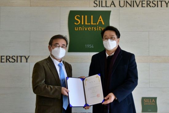신라대가 대학 내 외국인유학생을 위한 전문법률자문위원을 위촉했다. 김충석 신라대 총장(왼쪽)과 류인준 변호사가 7일 위촉식에서 기념사진을 촬영하고 있다.[아시아경제 영남취재본부 김용우 기자] 국내 대학들이 글로벌 캠퍼스로 성장하면서 외국인 유학생을 위해 전문적인 법률 상담을 해주는 대학이 생겼다.