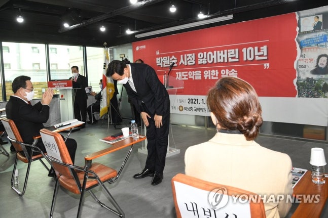 (서울=연합뉴스) 서울시장 보궐선거 출마선언을 한 국민의힘 소속 오세훈 전 서울시장이 20일 오후 서울 여의도 국민의힘 당사에서 열린 '박원순 시정 잃어버린 10년, 재도약을 위한 약속' 발표회에서 인사하고 있다. 2021.1.20 [국회사진기자단]