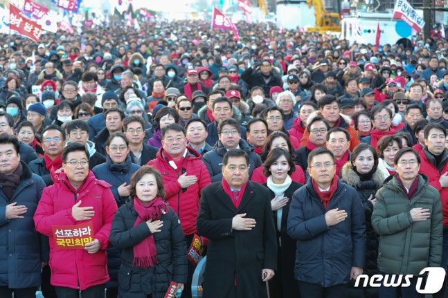 황교안 자유한국당 대표와 심재철 원내대표가 지난 1월3일 서울 광화문 세종문화회관 앞에서 열린 희망 대한민국 만들기 국민대회에서 의원들이 함께 국민의례를 하고 있다. © News1 허경 기자(서울=뉴스1) 강성규 기자 = 지난 연말 이후 잠시 멈춰있던 '패스트트랙-필리버스터' 대립 정국 재현이 초읽기에 들어간 가운데, 강하게 반대해 온 자유한국당에서 '이상기류'가 감지되고 있어 막판 국면 전환이 일어날지 관심을 모은다.