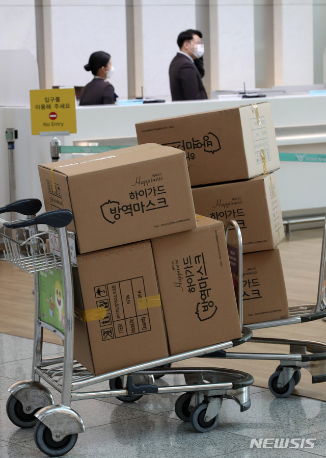 [인천공항=뉴시스] 고범준 기자 = 우한 폐렴(신종 코로나바이러스 감염증)이 빠르게 확산하고 있는 가운데 29일 오전 인천국제공항 제1여객터미널 출국장에 방역마스크가 카트에 실려 있다. 2020.01.29.