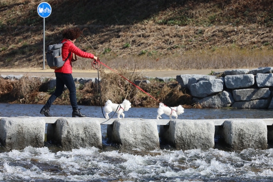 춘설 뒤 맑고 포근한 날씨가 찾아온 22일 한 시민이 애완견과 함께 대구 북구 동천동 팔거천둔치로 산책을 나와 징검다리를 건너고 있다./사진 = 뉴스 1얼음이 녹아 물이 될 정도로 봄기운이 돋는다는 '우수(雨水)'인 내일(19일)은 전국이 맑고 포근하겠다.