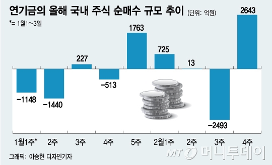 2일 한국거래소에 따르면 국내 증시가 급락한 지난주(2월24~28일) 연기금 등은 국내 주식 2643억원 어치를 순매수했다. 연기금 등에는 국민연금, 우정사업본부, 공무원연금 등 다양한 기관들이 있지만 이중 국민연금 투자분이 90% 이상이다.
