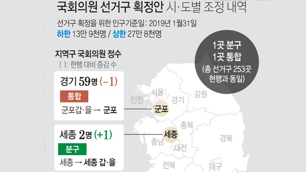 획정안은 세종 분구, 군포 통합과 함께 강원, 전남, 경북, 인천에서 전체 선거구 숫자는 유지한 채 일부 지역의 선거구를 재편하는 내용을 담고 있습니다.
