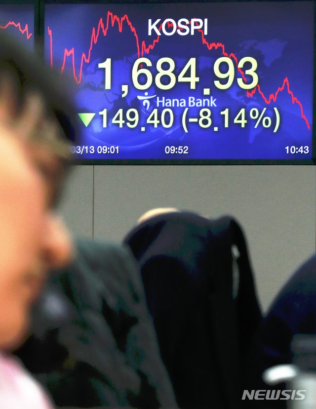 [서울=뉴시스]이윤청 기자 = 장중 코스피,코스닥 지수가 폭락세를 보이고 있는 13일 오전 서울 중구 하나은행 딜링룸에서 딜러들이 업무를 보고 있다. 오전 10시43분 코스피지수 8% 이상 하락이 1분간 지속돼 코스닥에 이어 코스피에서도 거래가 일시적으로 중지되는 서킷브레이커가 발동됐다. 코스피시장에 서킷브레이커가 발동된 것은 지난 2001년 9월12일 미국 9·11 테러로 증시가 폭락한 이후 18년6개월 만에 처음이다. 2020.03.13.