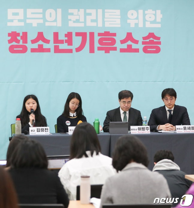 (서울=뉴스1) 허경 기자 = 청소년기후행동 학생들이 13일 서울 광화문 센터포인트에서 열린 정부의 소극적 기후대응 헌법소원 청구 기자회견에서 참석자들이 발언을 하고 있다. 2020.3.13/뉴스1