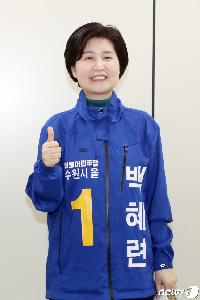 (수원=뉴스1) 조태형 기자 = 제21대 국회의원선거 후보 등록 첫 날인 26일 오전 경기도 수원시 권선구선거관리위원회에서 수원을에 출마한 백혜련 더불어민주당 후보가 등록을 마치고 각오를 밝히고 있다. 2020.3.26/뉴스1