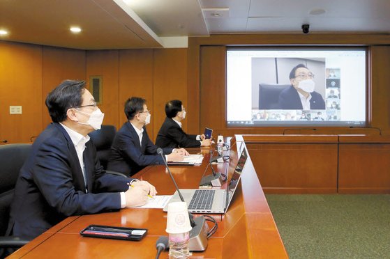 손태승 우리금융그룹 회장이 자회사 CEO 및 전국 영업본부장들과의 화상회의를 통해 코로나19 사태 대응체계를 점검하고 있다. [사진 우리금융그룹] 우리금융그룹이 코로나19 피해 확산을 막기 위해 전 그룹사의 보유 역량을 총동원해 대고객 금융 지원에 나서고 있다.