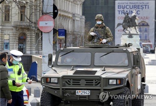 A Romanian armed soldier that wears a surgical mask and protection gloves guards a big intersection from his Humvee military vehicle as a policemen checks the documents of a passing by driver (L), in central Bucharest, Romania, 25 March 2020. Romania entered today in full lockdown across the country, involving the army to help Interior Ministry personnel to enforce these new measures. People under the age of 65 will be able to move out from their homes only to work or go shopping, as the elders were asked not to leave their homes anymore. All the civil flights in and from France and Germany, apart the specified ones, were suspended. Romanian authorities had confirmed 906 infected people, 14 deaths and 86 people recovered. EPA/ROBERT GHEMENT