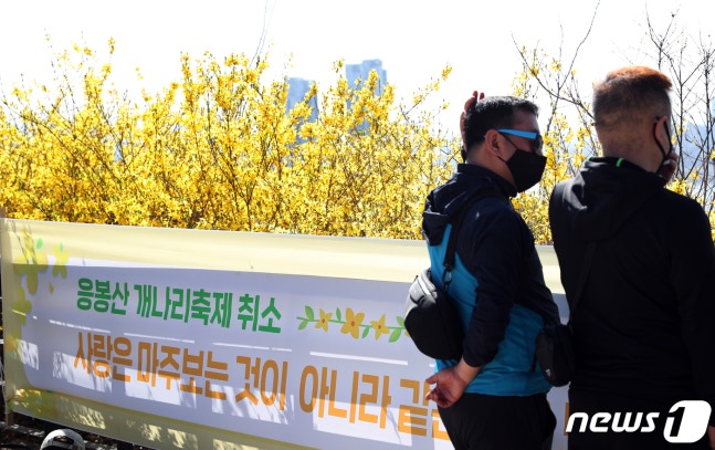 (서울=뉴스1) 황기선 기자 = 29일 오전 서울 성동구 응봉산에 '개나리 축제 취소'를 알리는 현수막이 걸려 있다. 성동구는 신종 코로나바이러스 감염증(코로나19) 지역사회 확산을 차단 하기위해 '응봉산 개나리 축제'를 취소한다고 밝혔다. 2020.3.29/뉴스1