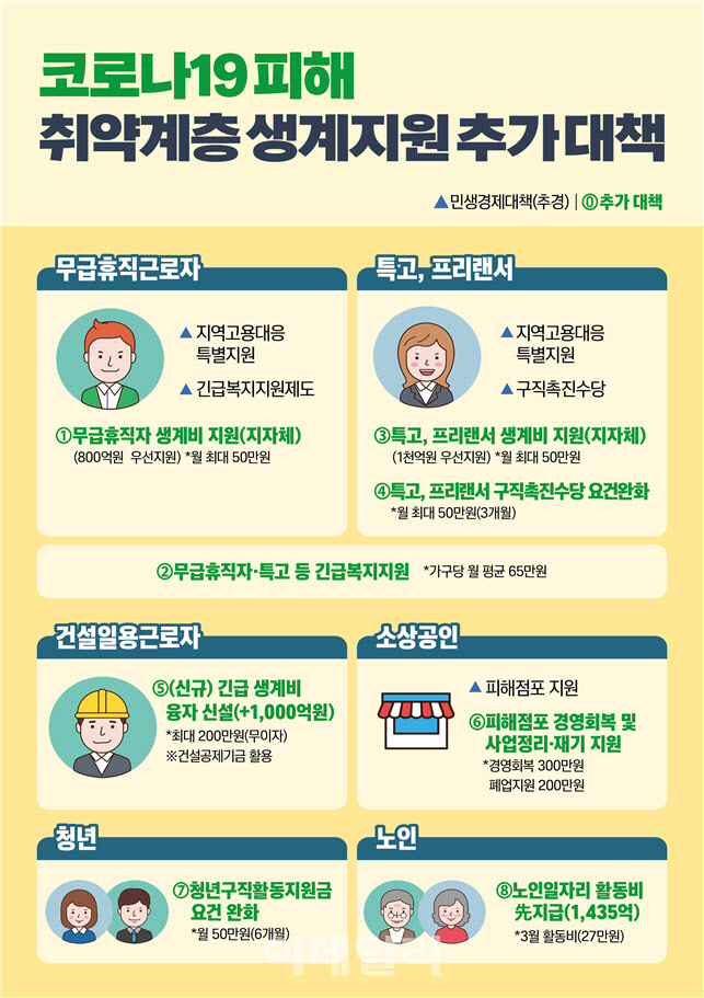 이날 고용부와 보건복지부, 중소벤처기업부는 문재인 대통령 주재로 이날 열린 제3차 비상경제회의에서 확정한 관계 부처 합동 취약계층 생계지원 방안을 발표했다.