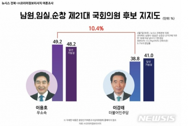 뉴시스전북본부는 이날, 남원임실순창 선거구 여론조사에서 '무소속 이용호 후보가 민주당 이강래 후보를 앞섰다'고 보도했다.
