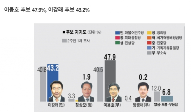 ▲전북도민일보, 전라일보, JTV전주방송, 전주MBC 의뢰로 (주)코리아리서치인터내셔널이 4월 6일부터 4월 7일까지 전라북도 남원·임실·순창 지역 만18세 이상 성인 남녀 503명을 대상으로 했으며, 유선RDD(Randdom Digit Dialing)와 무선가상전화 방식(유선 9%·무선 91%)으로 피조사자를 선정하여 전화면접조사방법으로 조사한 결과 ⓒ출처 : 전북도민일보 그러나, 전북도민일보와 전라일보, JTV, 전주MBC가 공동으로 코리아리서치에 의뢰해 지난 6일과 7일 이틀동안 실시한 여론조사 결과에서도 민주당 이강래 후보는 무소속 이용호 후보에게 오차범위에서 뒤지는 결과로 조사된 바 있다.
