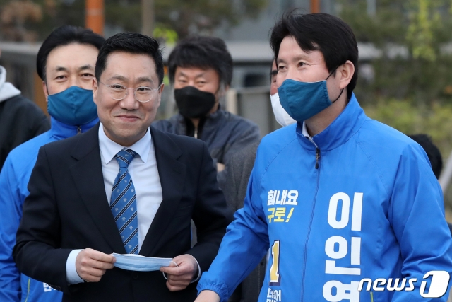 양정철 민주연구원장(왼쪽 2번째)과 이인영 더불어민주당 구로갑 후보(오른쪽)가 지난 10일 오후 서울 구로구 1호선 오류동역 앞에서 열린 현장유세에서 유권자들을 만나 나란히 걷고 있다. /사진=뉴스1.더불어민주당 지도부가 21대 총선을 앞둔 마지막 주말 수도권 집중유세에 나선다.