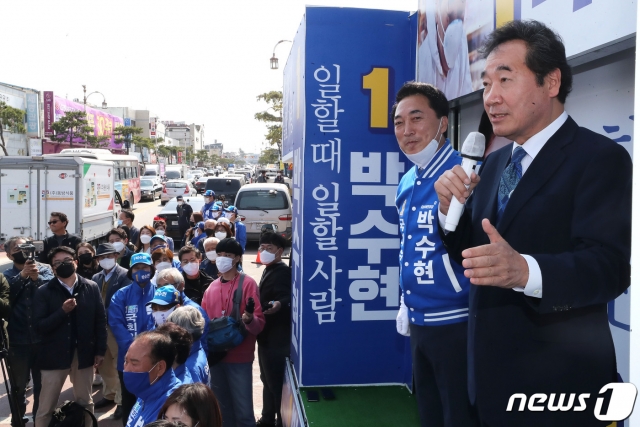 이낙연 더불어민주당 상임공동선대위원장(오른쪽)이 지난 10일 오후 충남 부여군 부여읍 성왕로 부여새시장에서 시민들에게 박수현 공주시부여군청양군 후보의 지지를 호소하고 있다. /사진=뉴스1.서울 권역 선대위원장인 이인영 원내대표는 인천을 방문해 연수을 정일영 후보, 중구강화군옹진 조택상 후보를 지원한다.