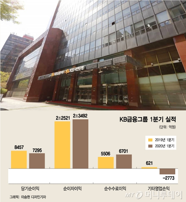KB금융그룹 1분기 실적/그래픽=이승현 디자인기자코로나19발 금융권 실적 악화가 현실이 됐다. 가장 먼저 1분기 실적을 발표한 KB금융그룹이 시장전망치를 밑도는 7295억원의 순이익을 냈다. KB금융그룹은 비은행 부문 실적 개선, 우량기업 위주의 대출을 통해 3조원대 연간 순이익을 유지할 계획이다.