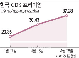 30일 국제금융센터에 따르면 한국 CDS 프리미엄(5년 만기 외국환평형기금채권)은 지난 28일 37.28bp(1bp=0.01%포인트)를 나타냈다. 한국 CDS 프리미엄은 올초 21.88bp를 나타냈으나 코로나19 확산세가 한창이던 3월 하순께 56bp까지 급등했다. 이어 코로나19가 진정 국면에 들어선 4월들어 30bp 미만으로 떨어졌다가 중순이후 다시 상승세로 전환했다.