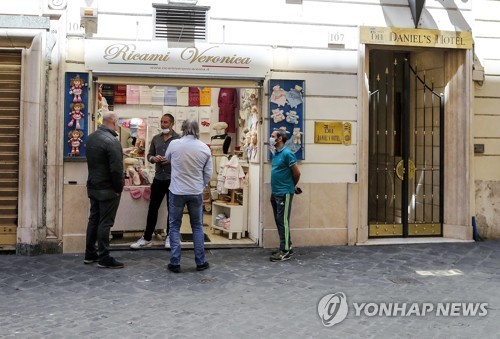 People wear protective masks outside a children's clothing store on the first day of Phase 2 during the coronavirus lockdown in Rome, Italy, 04 May 2020. The Italian government gradually lifts the lockdown restrictions that were implemented to stem the widespread of the Sars-Cov-2 coronavirus causing the Covid-19 disease. EPA/RICCARDO ANTIMIANI