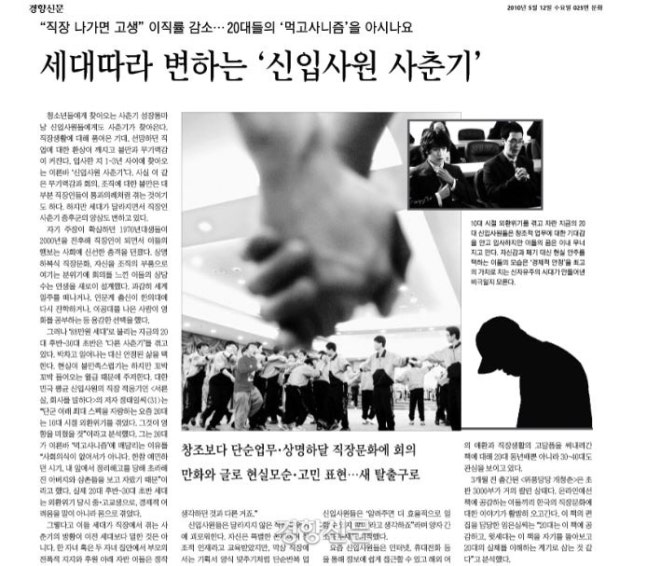 ‘세대따라 변하는 신입사원 사춘기’ 라는 제목의 해당 기사는 “88만원 세대로 불리는 20대 후반~30대 초반은 박차고 일어나는 대신 안정된 삶을 택한다”며 “이는 ‘경제적 안정’을 최고 가치로 치는 신자유주의 시대가 만들어낸 비극일지도 모른다”고 전했습니다. <서른살, 회사를 말하다>의 저자 정태일씨는 경향신문과 인터뷰에서 ‘20대가 먹고사니즘에 매달리는 이유’에 대해 “사회의식이 없어서가 아니라, 한참 예민하던 시절 정리 해고를 당해 초라해진 아버지와 삼촌을 보고 자라며 몸으로 겪었기 때문”이라고 했습니다.