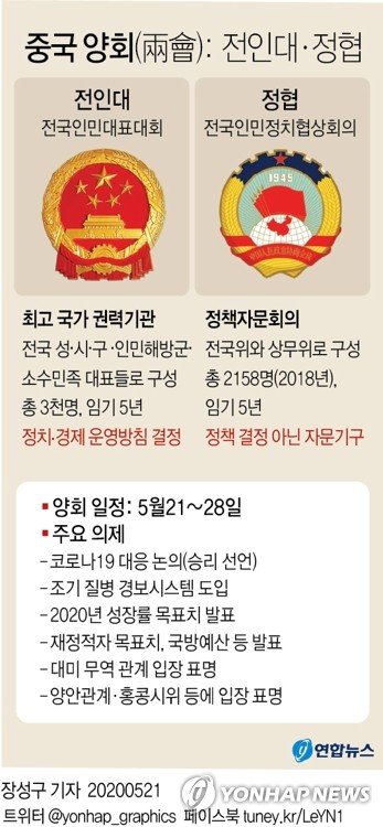 (서울=연합뉴스) 장성구 기자 = 신종 코로나바이러스 감염증(코로나19) 사태로 두 달 반 동안 연기됐던 중국 '양회'(兩會)가 21일 개막해 28일까지 이어진다.