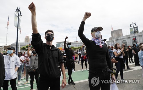 Protesters demonstrate over the Minnesota arrest of George Floyd, who later died in police custody, near City Hall in San Franciwco, California, USA, 30 May 2020. A bystander's video posted online on 25 May, appeared to show George Floyd, 46, pleading with arresting officers that he couldn't breathe as an officer knelt on his neck. The unarmed black man later died in police custody. EPA/JOHN G. MABANGLO