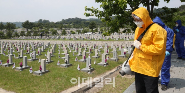 [이데일리 방인권 기자] 6월 호국보훈의 달을 하루 앞둔 31일 서울 동작구 국립서울현충원에서 직원들이 방역작업을 하고 있다.