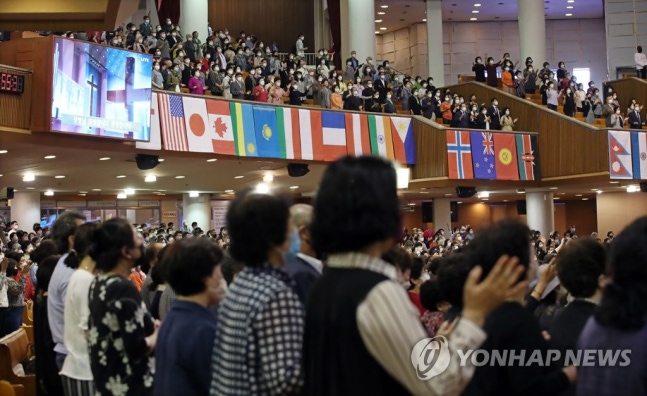(서울=연합뉴스) 김인철 기자 = 31일 오전 서울 영등포구 여의도 순복음교회에서 마스크 쓴 신도들이 예배를 드리고 있다. 2020.5.31