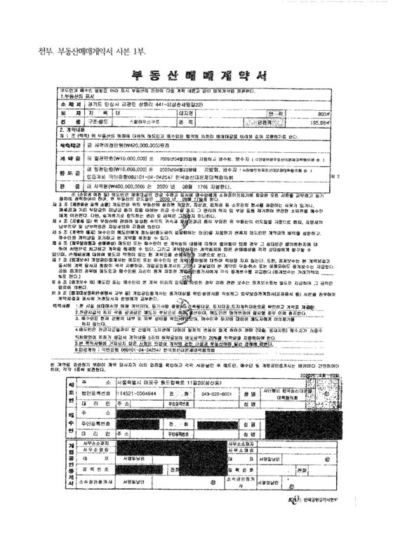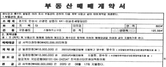 미래통합당 ‘위안부 할머니 피해 진상규명 TF’ 곽상도 위원장이 2일 공개한 안성 위안부 쉼터(‘평화와 치유가 만나는 집’) 매매 계약서다. 지난 4월 23일 작성된 계약서로 사회복지공동모금회를 통해 입수했다. 매도자는 사단법인 한국정신대문제대책협의회(정대협), 매수자는 가려져 있다.