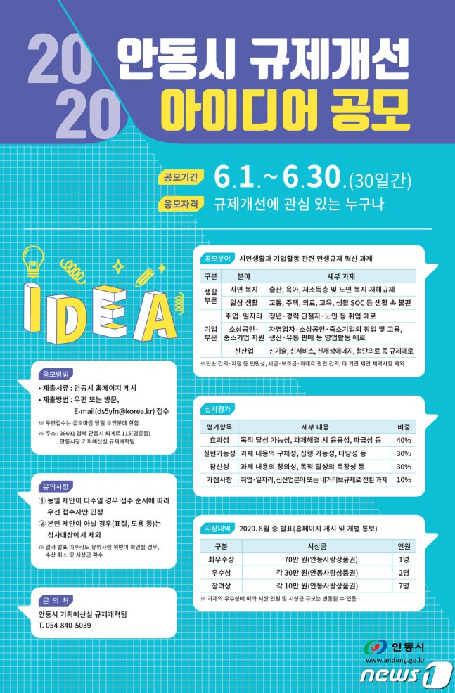 안동시는 오는 30일가지 규제개선 아이디어공모전을 개최한다.© 뉴스1(대구ㆍ경북=뉴스1) 김대벽 기자 = 안동시는 8일 시민 생활과 기업 활동의 불합리한 규제 개선을 위한 아이디어를 공모한다.