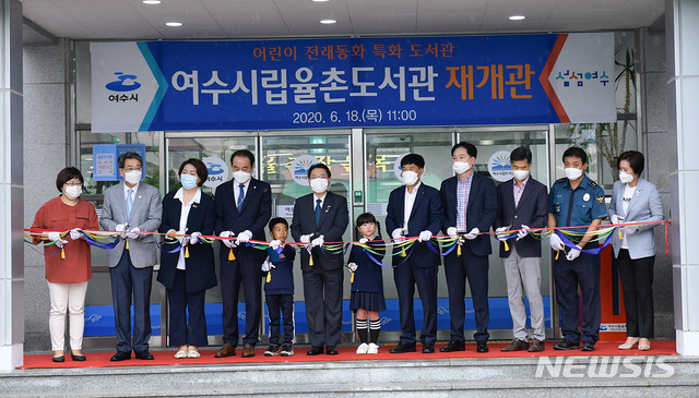[여수=뉴시스]김석훈 기자 = 18일 어린이 전래동화 특화 도서관으로 새단장을 마친 '여수시립율촌도서관 재개관식'에서 권오봉 여수시장을 비롯한 주요 내빈이 테이프컷팅을 하고 있다. (사진=여수시청 제공) 2020.06.18. photo@newsis.com [여수=뉴시스]김석훈 기자 = 전남 여수시립율촌도서관이 어린이 전래동화 특화도서관으로 새 단장을 마치고 재개관했다.