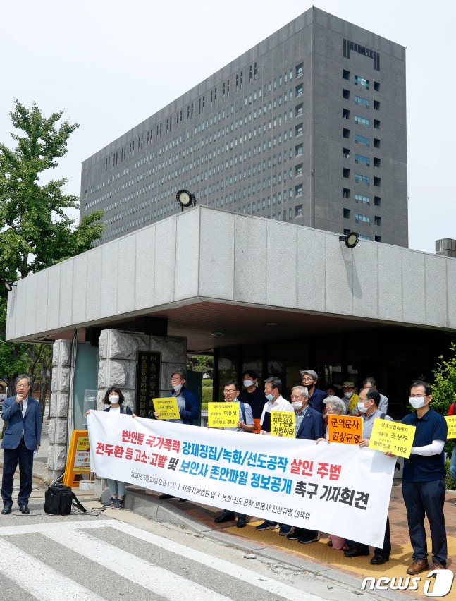 (서울=뉴스1) 안은나 기자 = 23일 오전 서울 서초구 중앙지방검찰청 앞에서 열린 '전두환, 최경조, 서의남 형사고소·고발과 보안사 존안파일 정보공개 촉구 기자회견'에서 참가자들이 손팻말을 들고 있다. 녹화·선도공작 의문사진상규명대책위원회는 전두환 집권 당시 녹화·선도공작으로 9명의 사망자와 피해자들이 발생한 것에 대해 전두환 전 대통령, 당시 보안사 대공처장이었던 최경조, 경남지구 보안부대 대공과장이었던 서의남을 검찰에 고소·고발했으며 의문사를 밝히기 위해 국방부 보안사가 자료를 공개해야 한다고 요구했다. 2020.6.23/뉴스1