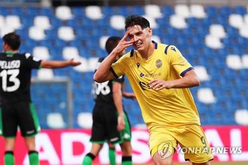 Hellas Verona's Mariusz Stepinski (R) celebrates after scoring the 2-1 lead during the Italian Serie A soccer match between US Sassuolo Calcio and Hellas Verona in Reggio Emilia, Italy, 28 June 2020. EPA/SERENA CAMPANINI