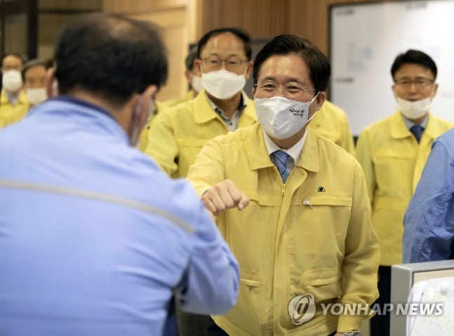 (서울=연합뉴스) 윤동진 기자 = 2020년 여름철 전력수급 현장점검을 위해 6일 오전 마포구 한국중부발전 서울발전본부 상황실을 찾은 성윤모 산업통상자원부 장관이 직원들과 인사를 하고 있다. 2020.7.6