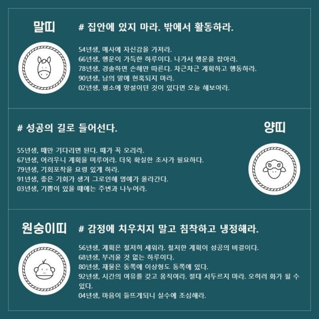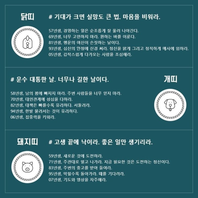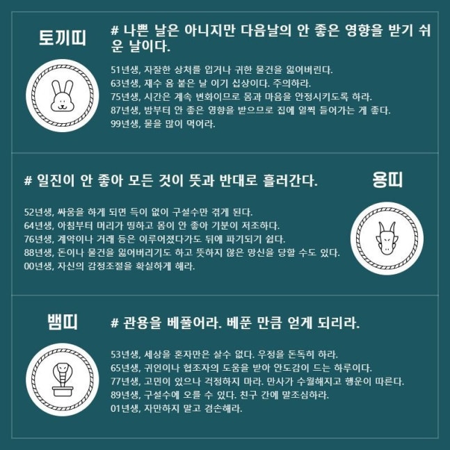 > [일간스포츠 ] 자료제공 : 점신 쥐띠 # 구설수를 조심하라. 말조심, 행동 조심하라. 48년생, 사람을 가려 사귀어라. 너무 마음을 주지 마라. 60년생, 사업을 하는 사람은 갑작스런 손실이 있을 수 있으니 주의하라. 72년생, 자만하면 일만 그르친다. 84년생, 질병에 주의하라. 병은 생각지도 못 할 때 발생한다. 96년생, 욕심이 생겨서 판단력이 흐려진다. 소띠 # 기회는 또 오니 걱정 마라. 너무 실망하지 마라. 49년생, 초조해 할 것 없다. 곳 나아질 것이다. 61년생, 허욕을 버리면 세상이 달라 보이리라. 마음을 비워라. 73년생, 남의 얘기에 귀 기울여라. 도움이 된다. 85년생, 다툴 일은 피하는 것이 좋다. 욕심이 앞서면 손실이 따를 뿐이다. 97년생, 혼자서 할 수 없으니 도움을 구해라. 범띠 # 가장 길한 날이다. 성공을 길이 보이리라. 50년생, 오전에는 약간 울적한 듯하지만 금세 기분이 전환된다. 62년생, 몸의 컨디션도 좋고 마음도 안정되어 일에 집중이 잘된다. 74년생, 직업상 거래도 자신에게 유리하게 잘 풀어나갈 수 있다. 86년생, 금전운이 있는 날이라 잊어버린 돈이나 비상금을 찾게된다. 98년생, 멀리 있거나 가질 수 없는 것에 욕심내지마라. 토끼띠 # 나쁜 날은 아니지만 다음날의 안 좋은 영향을 받기 쉬운 날이다. 51년생, 자잘한 상처를 입거나 귀한 물건을 잃어버린다. 63년생, 재수 옴 붙은 날 이기 십상이다. 주의하라. 75년생, 시간은 계속 변화이므로 몸과 마음을 안정시키도록 하라. 87년생, 밤부터 안 좋은 영향을 받으므로 집에 일찍 들어가는 게 좋다. 99년생, 물을 많이 먹어라. 용띠 # 일진이 안 좋아 모든 것이 뜻과 반대로 흘러간다. 52년생, 싸움을 하게 되면 득이 없이 구설수만 겪게 된다. 64년생, 아침부터 머리가 띵하고 몸이 안 좋아 기분이 저조하다. 76년생, 계약이나 거래 등은 이루어졌다가도 뒤에 파기되기 쉽다. 88년생, 돈이나 물건을 잃어버리기도 하고 뜻하지 않은 망신을 당할 수도 있다. 00년생, 자신의 감정조절을 확실하게 해라. 뱀띠 # 관용을 베풀어라. 베푼 만큼 얻게 되리라. 53년생, 세상을 혼자만은 살수 없다. 우정을 돈독히 하라. 65년생, 귀인이나 협조자의 도움을 받아 안도감이 드는 하루이다. 77년생, 고민이 있으나 걱정하지 마라. 만사가 수월해지고 행운이 따른다. 89년생, 구설수에 오를 수 있다. 친구 간에 말조심하라. 01년생, 자만하지 말고 겸손해라. 말띠 # 집안에 있지 마라. 밖에서 활동하라. 54년생, 매사에 자신감을 가져라. 66년생, 행운이 가득한 하루이다. 나가서 행운을 잡아라. 78년생, 경솔하면 손해만 따른다. 차근차근 계획하고 행동하라. 90년생, 남의 말에 현혹되지 마라. 02년생, 평소에 망설이던 것이 있다면 오늘 해보아라. 양띠 # 성공의 길로 들어선다. 55년생, 때만 기다리면 된다. 때가 꼭 오리라. 67년생, 어려우니 계획을 미루어라. 더욱 확실한 조사가 필요하다. 79년생, 기회포착을 요령 있게 하라. 91년생, 좋은 기회가 생겨 그로인해 명예가 올라간다. 03년생, 기쁨이 있을 때에는 주변과 나누어라. 원숭이띠 # 감정에 치우치지 말고 침착하고 냉정해라. 56년생, 계획은 철저히 세워라. 철저한 계획이 성공의 비결이다. 68년생, 부러울 것 없는 하루이다. 80년생, 재물은 동쪽에 이상형도 동쪽에 있다. 92년생, 시간의 여유를 갖고 움직여라. 절대 서두르지 마라. 오히려 화가 될 수 있다. 04년생, 마음이 들뜨게되니 실수에 조심해라. 닭띠 # 기대가 크면 실망도 큰 법. 마음을 비워라. 57년생, 경영하는 일은 순조롭게 잘 풀려 나아간다. 69년생, 너무 고민하지 마라. 원하는 바를 이룬다. 81년생, 행운의 여신이 손짓하는 날이다. 93년생, 심신의 안정에 신경 써라. 정신을 맑게 그리고 정직하게 매사에 임하라. 05년생, 갑작스럽게 다가오는 사람을 조심해라. 개띠 # 운수 대통한 날. 너무나 길한 날이다. 58년생, 남의 꾐에 빠지지 마라. 주변 사람들을 너무 믿지 마라. 70년생, 대인관계에 성심을 다하라. 82년생, 대책은 빠를수록 유리하다. 서둘러라. 94년생, 한발 물러서는 것이 유리하다. 06년생, 집중력을 키워라. 돼지띠 # 고생 끝에 낙이라. 좋은 일만 생기리라. 59년생, 새로운 것에 도전하라. 71년생, 주관대로 밀고 나가라. 지금 필요한 것은 도전하는 정신이다. 83년생, 주변의 충고를 받아 들여라. 95년생, 막힐수록 돌아가라. 때를 기다려라. 07년생, 기도와 명상을 자주해라.