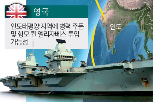 파이낸셜타임스는 5일 “영국군이 중국의 점증하는 위협에 대응하기 위해 동쪽으로 향하고 있다”며 영국 정부가 수백 명의 병력을 이집트 수에즈운하 동쪽에 배치하는 방안을 검토 중이라고 전했다. 영국은 F-35B 수직이착륙 스텔스 전투기를 탑재하는 항모 퀸 엘리자베스호를 내년 이후 인도태평양 지역에 배치할 예정이다. 이를 두고 미국이 남중국해에서 진행 중인 ‘항행의 자유’ 작전에 퀸 엘리자베스호가 합류할 가능성이 제기된다. 영국은 2018년 상륙함 알비온함을 영유권 분쟁지역인 남중국해 스프래틀리군도 근해에 투입해 중국의 강력한 반발을 불러일으켰다.