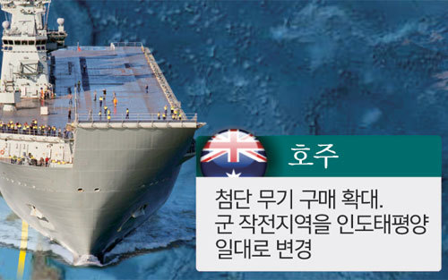 코로나19 발원지 국제조사와 사이버 해킹 등으로 중국과 갈등을 빚었던 호주는 군사력 증강을 서두르고 있다. 스콧 모리슨 호주 총리는 1일 정책 연설에서 “국방력 강화를 위해 10년간 2700억 호주달러(약 225조원)를 투입하겠다”고 밝혔다. 호주는 미국산 AGM-158C 장거리 대함미사일(LRASM)과 드론 등을 도입할 계획이다. 록히드마틴이 생산하는 AGM-158C는 음속에 가까운 속도로 레이더를 피해 370㎞ 이상을 날아가는 스텔스 무기다. 호주는 군사력 증강을 위한 투자를 늘리면서 군의 활동 범위를 인도태평양 지역에 집중할 예정이다.