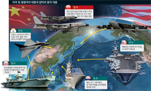 중국을 겨냥한 미국과 우방국들의 포위망이 점점 가시화하고 있다. 중국이 남중국해에 대한 장악력을 높이고 홍콩 국가보안법을 강행하자, 미국은 전략자산을 인도태평양에 잇따라 투입하며 대중국 견제를 본격화했다. 여기에 호주와 인도, 북대서양조약기구(나토·NATO) 등도 미국의 움직임에 적극 호응하는 모양새다. 인도태평양지역을 둘러싼 미·중 갈등이 격화될 우려가 커지고 있다.