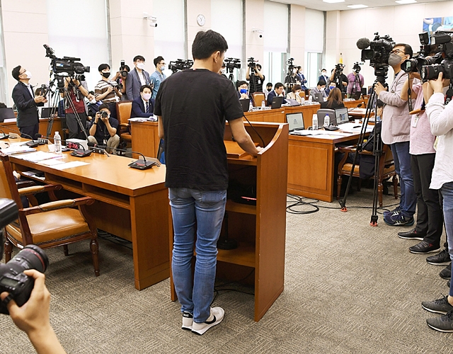 트라이애슬론 선수 고(故) 최숙현에게 가혹행위를 한 혐의를 뒤늦게 인정한 경주시청 트라이애슬론팀의 김도환이 22일 국회에서 열린 ‘철인3종경기 선수 가혹행위 및 체육 분야 인권침해에 대한 청문회’에서 국회 문화체육관광위원회 의원들의 질의에 답하고 있다. 최종학 선임기자트라이애슬론 선수 고(故) 최숙현 사망 관련 국회 청문회가 22일 열렸다. 하지만 주요 가해자 증인이 모두 불출석한 ‘반쪽짜리’에 그치면서 사건 해결에 필요한 실질적인 증언은 나오지 못했다.