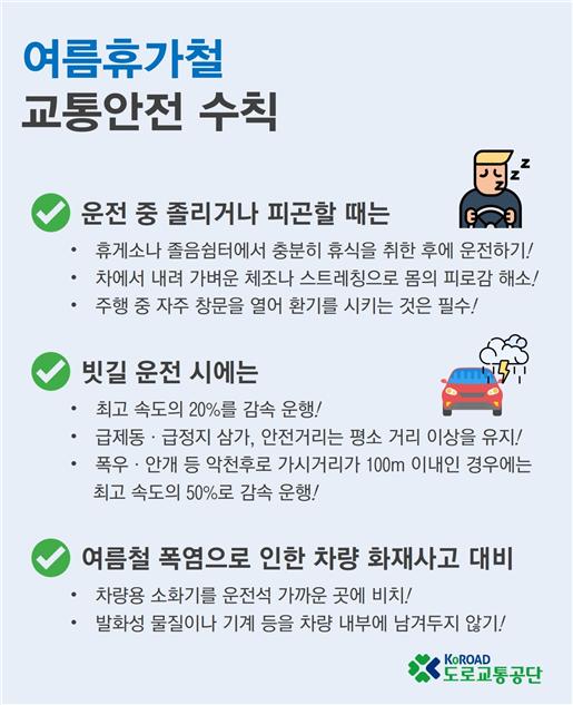 휴가철 교통사고 유발 요인은 피로·졸음으로 인한 부주의, 여름철 집중호우로 인한 빗길 위험 등이 지목된다. 장시간 운전으로 운전자가 피로해지기 쉽고, 집중력 저하와 졸음 등으로 교통사고 위험이 높아지기 때문이다. 운전 전에는 충분한 휴식을 취하고, '졸리면 쉬어가기'를 지켜야 사고를 예방할 수 있다.