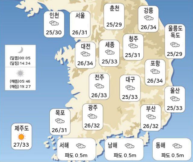 내일 아침기온은 서울 26.0도, 인천 25.0도, 수원 25.0도, 춘천 25.0도, 강릉 27.0도, 청주 25.0도, 대전 26.0도, 전주 26.0도, 광주 26.0도, 대구 25.0도, 부산 26.0도, 제주 27.0도로 예상됩니다.