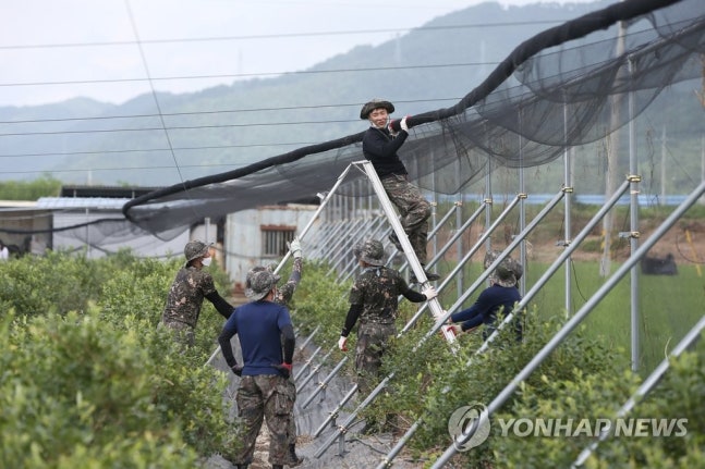 (나주=연합뉴스) 천정인 기자 = 13일 오후 전남 나주시 다시면 가흥리에서 31사단 장병들이 수해 피해를 입은 비닐하우스 일손을 돕고 있다. 2020.8.13