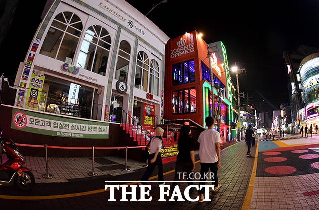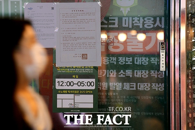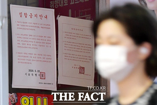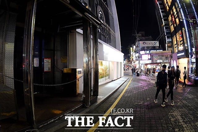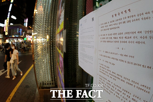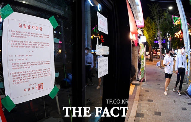 코로나19 재확산으로 사회적 거리두기 2단계가 시행된 19일 오후 서울 마포구 홍대입구역 일대의 클럽 및 노래방 입구에 집합금지명령문이 붙어있다. /이선화 기자[더팩트|이선화 기자] 코로나19 재확산으로 사회적 거리두기 2단계가 시행된 19일 오후 서울 마포구 홍대입구역 일대의 클럽 및 노래방 입구에 집합금지명령문이 붙어있다.